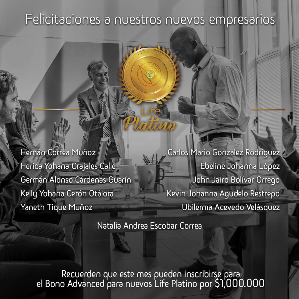 Felicitamos a los empresarios que trabajaron durante todo el mes de Mayo para llegar al titulo de Life Platino y los invitamos a que se inscriban para participar en el Bono Advanced para ser uno de los ganadores de 1 millón de pesos en el mes de Junio 2021.